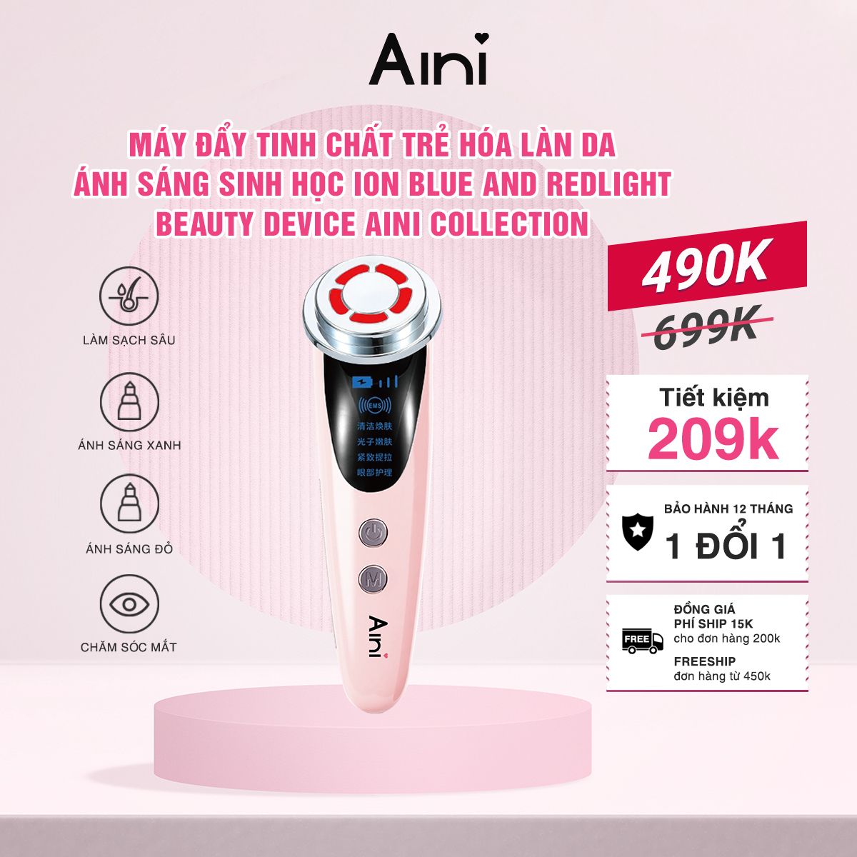 Máy đẩy tinh chất trẻ hóa làn da ánh sáng sinh học Ion Blue and Red Light Beauty Device AINI COLLECTION